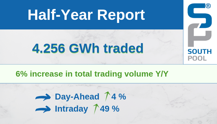First-Half trading acitivity - 6% increase 01.07.2019 We have noticed a continuation of a positive trend in trading activity on BSP SouthPool.Total trading volume in the First-half amounted to 4.256 GWh, which represents a 6% increase in comparison to the same period last year.- Trading volume on Day-ahead trading segment reached 4.005 GWh (4,3% growth).- Trading volume on Intraday trading segment noticed even a 49% increase and totalled at 251 GWh. Kép Kép