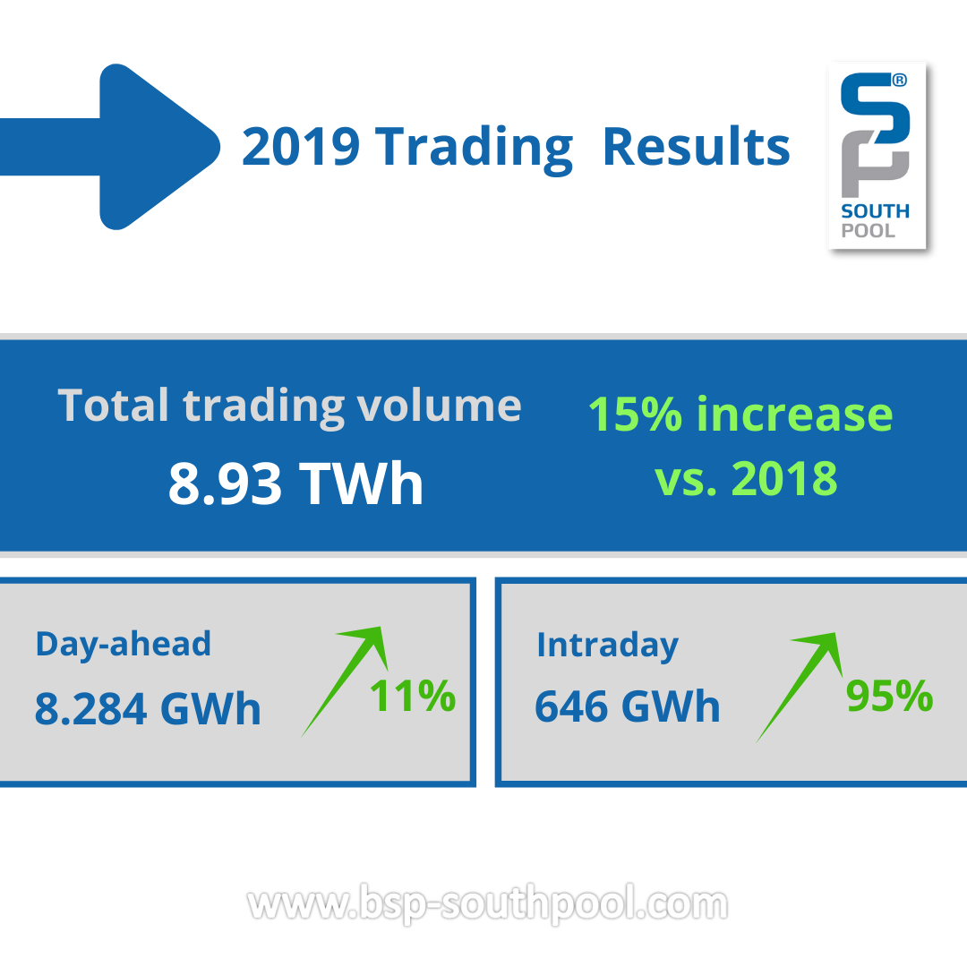 Total trading volume for 2019 reached above 8.93 TWh. We have noticed an increase by 11.3% on the Day-Ahead trading segment in comparison to 2018 (trading volume reached 8.28 TWh). On the other hand, Intraday trading volume amounted 646 GWh, which represents a 95% increase vs. 2018.