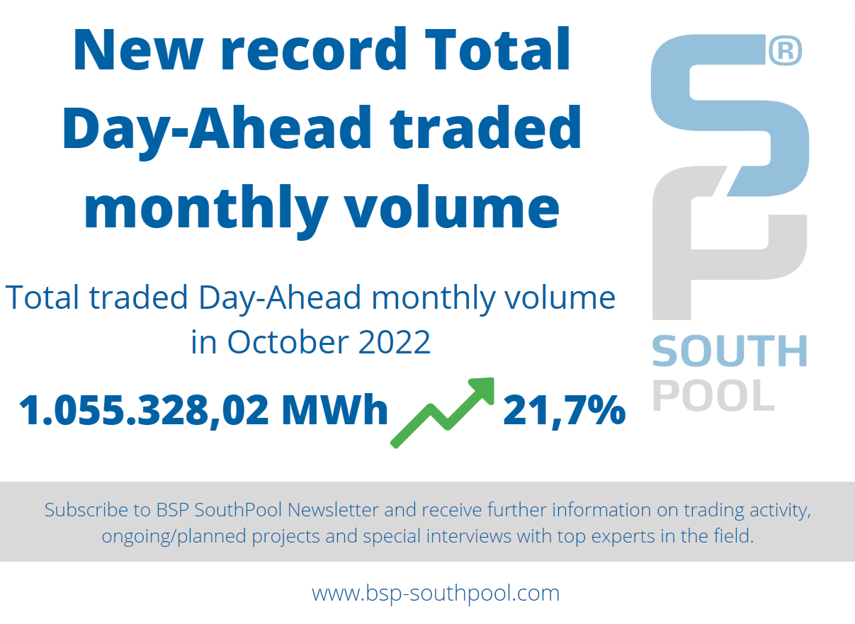 The strong volume traded on BSP Southpool energy exchange continues to flourish. We have recorded new total Day-Ahead monthly traded volume in October 2022. The total traded volume was 1.055.328,02 MWh and it have exceeded the previous record by 21,7%.